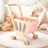 Carrito de la compra de madera de haya. Se trata de un carrito con altura regulable. Además, cuenta con un modelo redondeado en la base de las manos para ser más facil y cómodo su agarre. Con este carrito podrán jugar a ir de compras e incluso para pasear a sus muñecos y peluches.