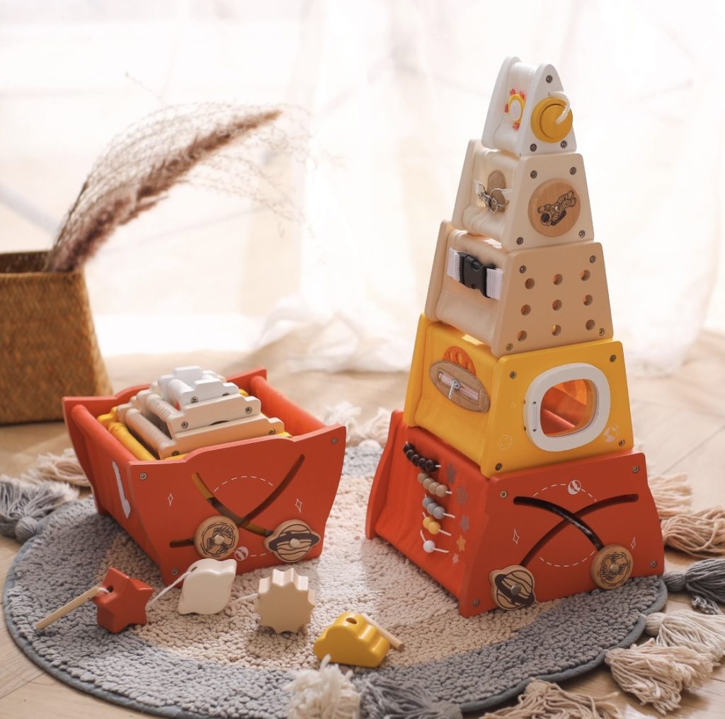 Castillo de madera de haya. Podemos encontrar 6 juegos en 1. Los peques podrán jugar sensorialmente. Recomendado a partir de los 18 meses.