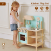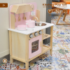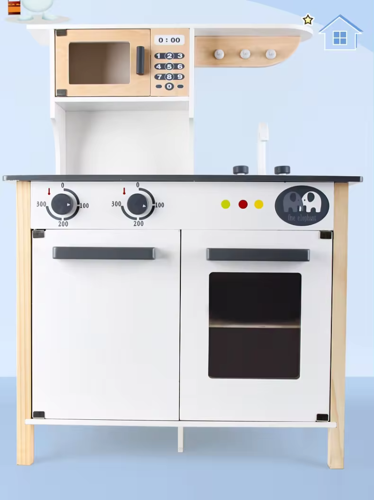 Cocinita de madera de haya. Se trata de una cocinita con encanto ya que presenta una campana extractora de madera. Su reloj y balda la hacen especial. Grifo de madera y pila de acero extraible. Dispone de 2 fogones en lso cuales puedes poner la sarten o olla de los que dispone la cocinita. Además, dispondrás de 3 sitios de almacenaje: dos baldas exteriores visibles y dos internas al abrir la puerta el horno.