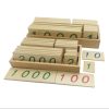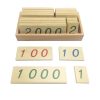 Caja sin tapa de madera que incluye cartas de madera con los números divididos en unidades, decenas, centenas y millares. Gracias a este juego podrán aprender de manera más visual y manipulativa la cración de los números hasta los millares.
