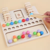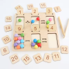 Se trata de un juego matemático de madera con doble opción de juego. Por un lado, podemos poner en el centro el número elegido y colocar las bolitas correspondientes al número para trabajar la asociaicón cantidad número. Para realizar este proceso podemos utilizar las pinzas y así trabajar al mismo tiempo la piscomotricidad fina. Por el otro lado, encontramos el tablero dividido en dos partes una dode poder realizar una suma y otra donde poder realizar una resta. Con los mismos materiales anteriores podremos colocar las bolas e incluso las tarjetitas pequeñas con los números tanto en las cantidades a sumar y restar como en las solucines. Otros juegos que podemos realizar sin tener el tablero 2×1 es crear la serie ascendente y descente de los números 1-20 gracias a sus pequeñas tarjetas fáciles de manejar.