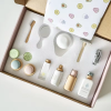 Set de esteticista que permite convertirse en un profesional rápidamente. Este juego incluye: bolsita con 3 mascarillas de diferentes colores, un turbante para la clienta, uncuenco donde poner el producto, un espejo demano, dos utensilios para trabajar la cara, dos rodajas de pepino para los ojos, un bote de crema solar, un bote de crema hidratante, dos botes con cremas aromáticas, y dos cuencos con tapa de crema hidratante más especial. (la tabla que se observa en la foto no va incluido en el producto)