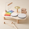 Juguete musical de madera. Se trata de una mesa multifuncional donde podemos encontrar diferentes instruementos musicales como un xilófono de 8 piezas, dos tambores de diferentes tamaños, un platillo… ideales para edades tempranas y estimular a los más peques.