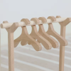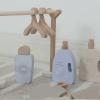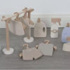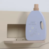 Lavadora de madera que cuenta con una puerta que se abre, botones que imitan la temperatura y programa, cajón donde poner el jabón y el suavizante. Además, esta lavadora incluye un perchero con 4 perchas y ropa, una plancha, suavizante, jabón, detergente y un kit quitamanchas.