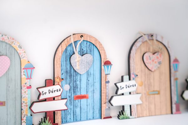Puertas del Ratoncito Pérez que sirven para colgarse o para dejar en el suelo de la habitación de los más peques de la casa y que juegue la mágia. Esta disponible en 4 colores: azul, verde y corazón rosa a puntos; color nata y corazón rosa y color crudo y cerezas. ¿Cual es tu preferida?