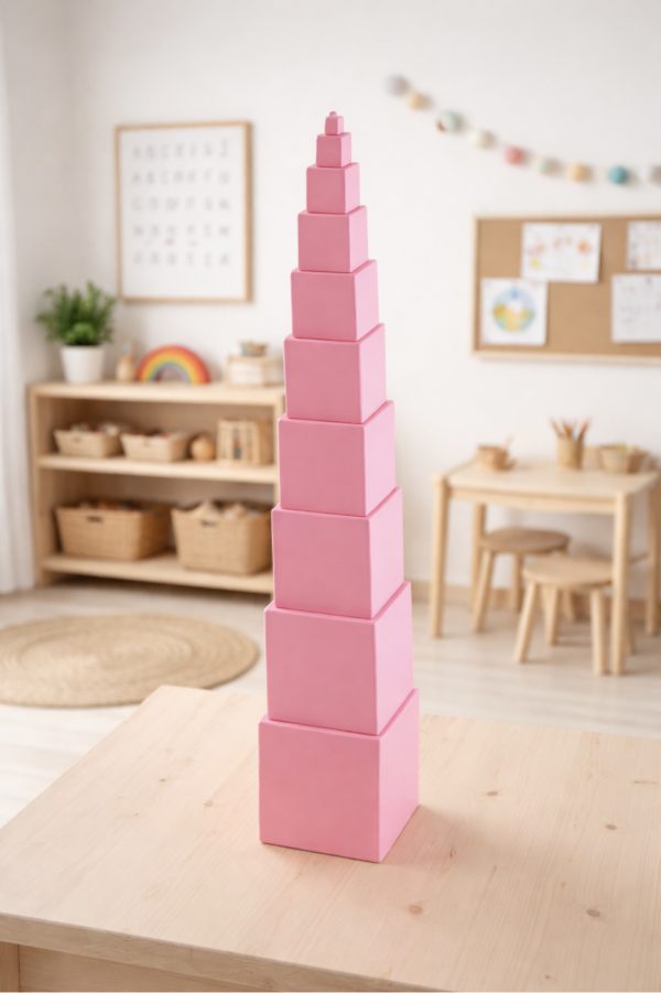 La Torre Rosa sirve para asimilar de manera sensorial la diferencia de volúmenes, pesos y tamaños. Fabricada en madera de haya. Está formada por 10 cubos que aumentan de tamaño de 1 a 10 cm cúbicos. Los cubos desarrollan la discriminación visual de tamaño en tres dimensiones. Sus medidas son: Cubo más grande: 10 x 10 x 10 cm. Cubo más pequeño: 1 x 1 x 1 cm.