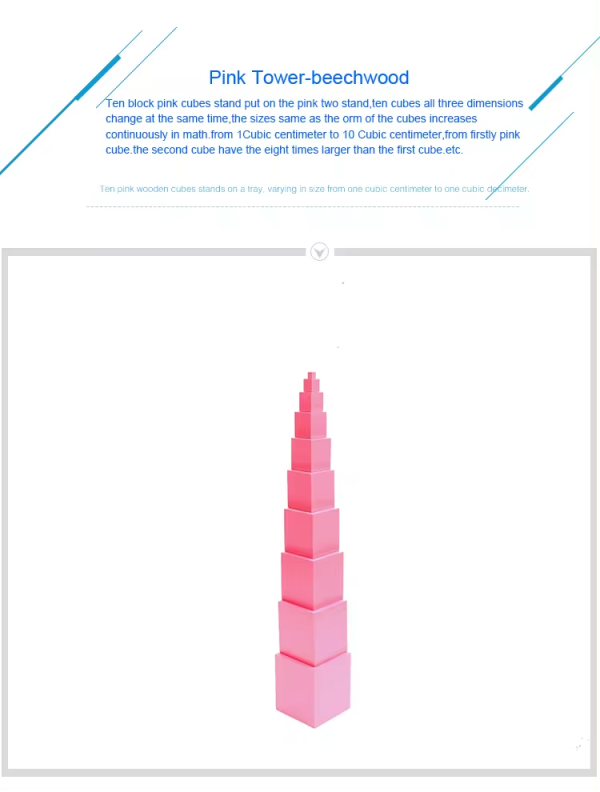 La Torre Rosa sirve para asimilar de manera sensorial la diferencia de volúmenes, pesos y tamaños. Fabricada en madera de haya. Está formada por 10 cubos que aumentan de tamaño de 1 a 10 cm cúbicos. Los cubos desarrollan la discriminación visual de tamaño en tres dimensiones. Sus medidas son: Cubo más grande: 10 x 10 x 10 cm. Cubo más pequeño: 1 x 1 x 1 cm.